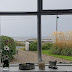 Treppe nach oben und sitzen vor der Glasfront, die den Blick über die Bucht auf